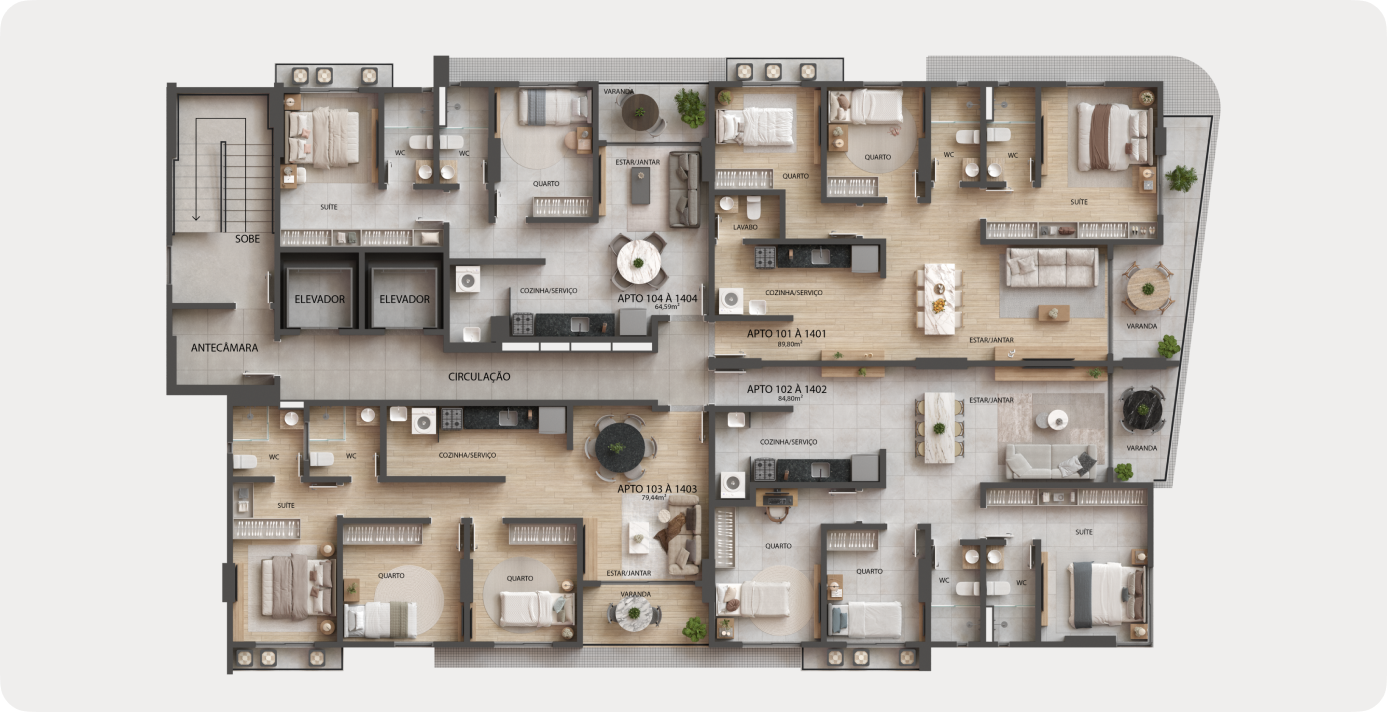 Os apartamentos tipo, de 64,59m² a 89,80m², com 2 e 3 quartos.